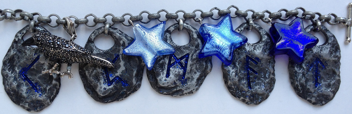 I love the weirdness and the hand-craftyness of the little charms. The pewter skull came from MoonRaven designs, and the runes from Rekon, but over all, it’s a really complicated piece, and too delicate to represent our story.