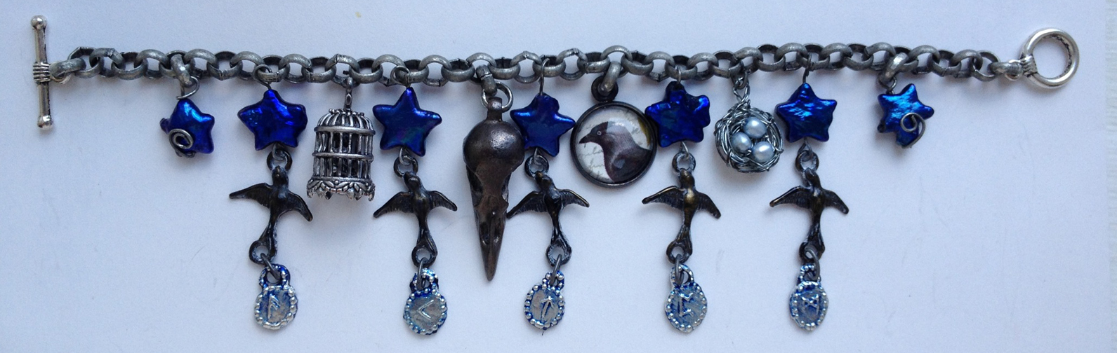 I gave up for a while, but then last April I was in Stockholm, and I saw these sterling charms from across the entire shop. They were perfect–modern, pretty and bold–like our girls–and a good fit with some enamel crows I’d found online. And so the cover bracelet was born with the help of a needle nosed pliers: