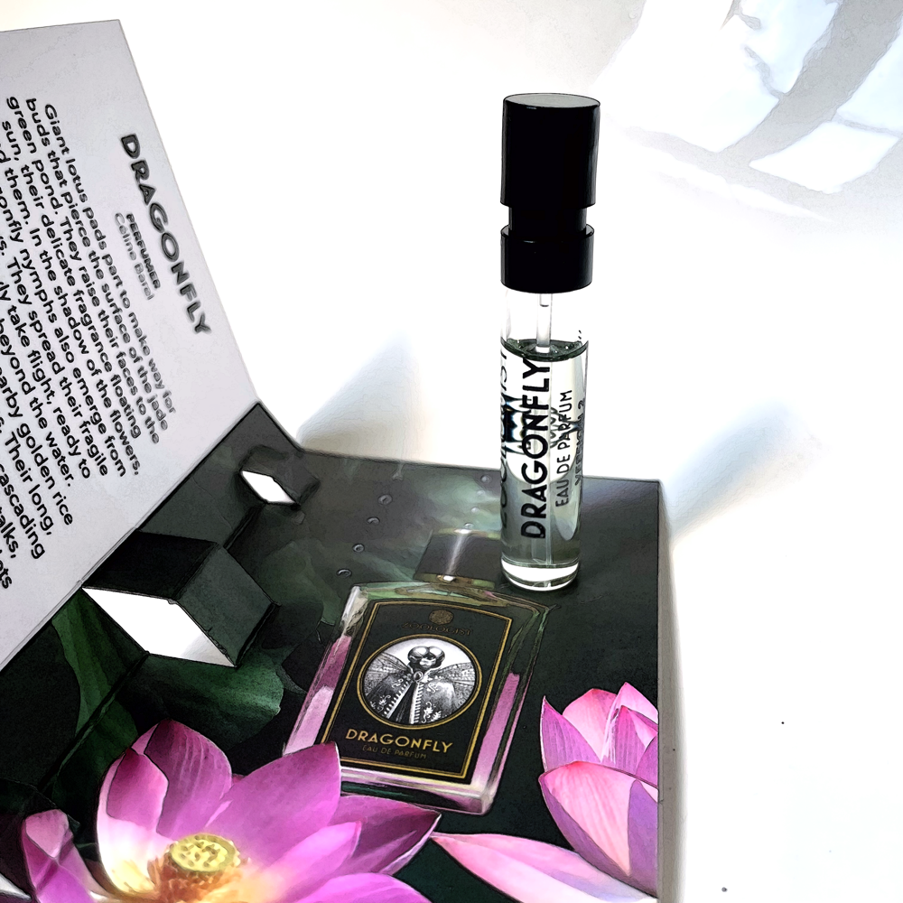 The 2021 remake of Dragonfly is a little lighter, I think–the amber and heliotrope is replaced with benzoin and ginger, with the wet notes lasting longer on the bottom.