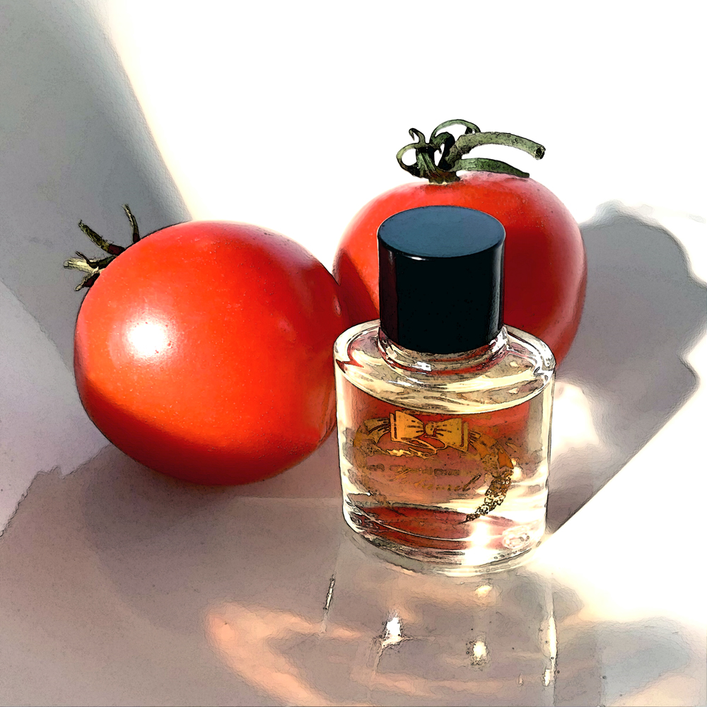A sunny day-drunk cocktail made with one part Chartreuse, one part Fleur Defendue, topped off with mango hard seltzer and garnished with tomato leaf.