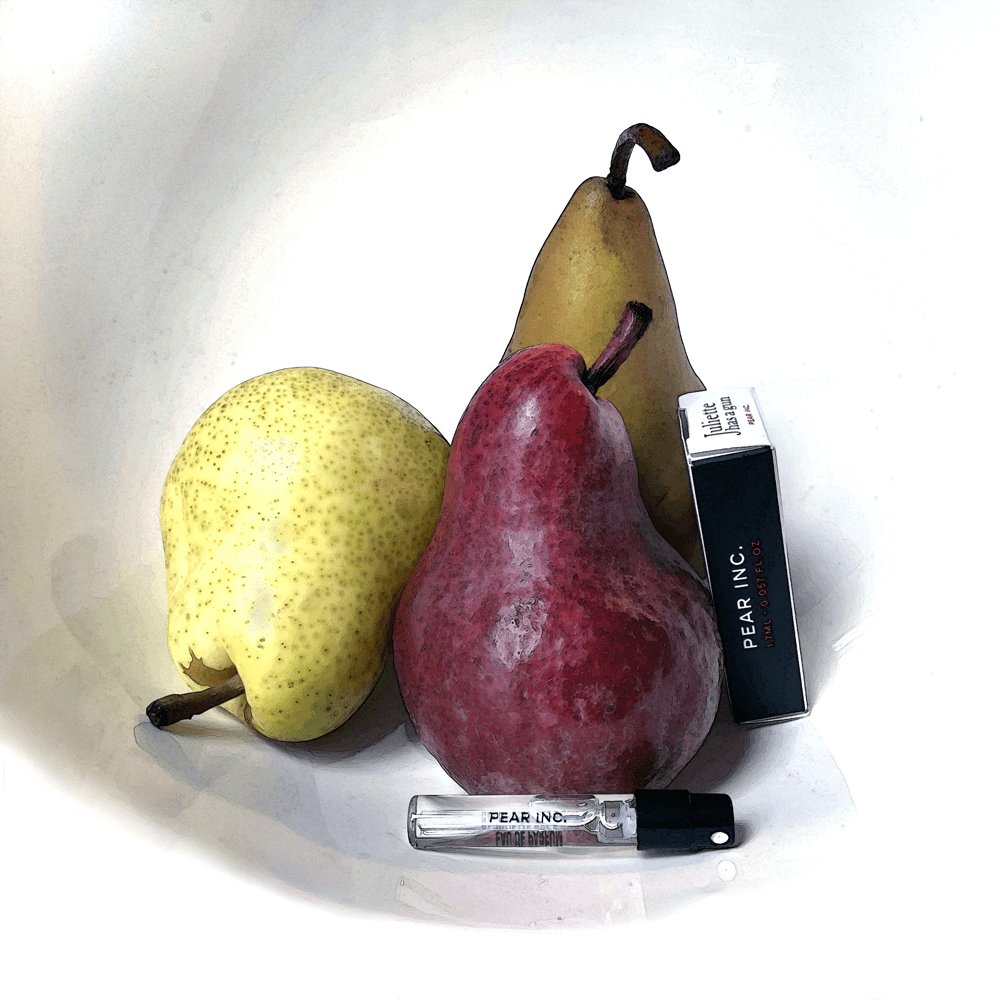 Pears covered in silver leaf that slowly tarnishes to dull fog and rain–ripe and juicy but with a metallic edge, carried in intimate space with a misty wet musk.
