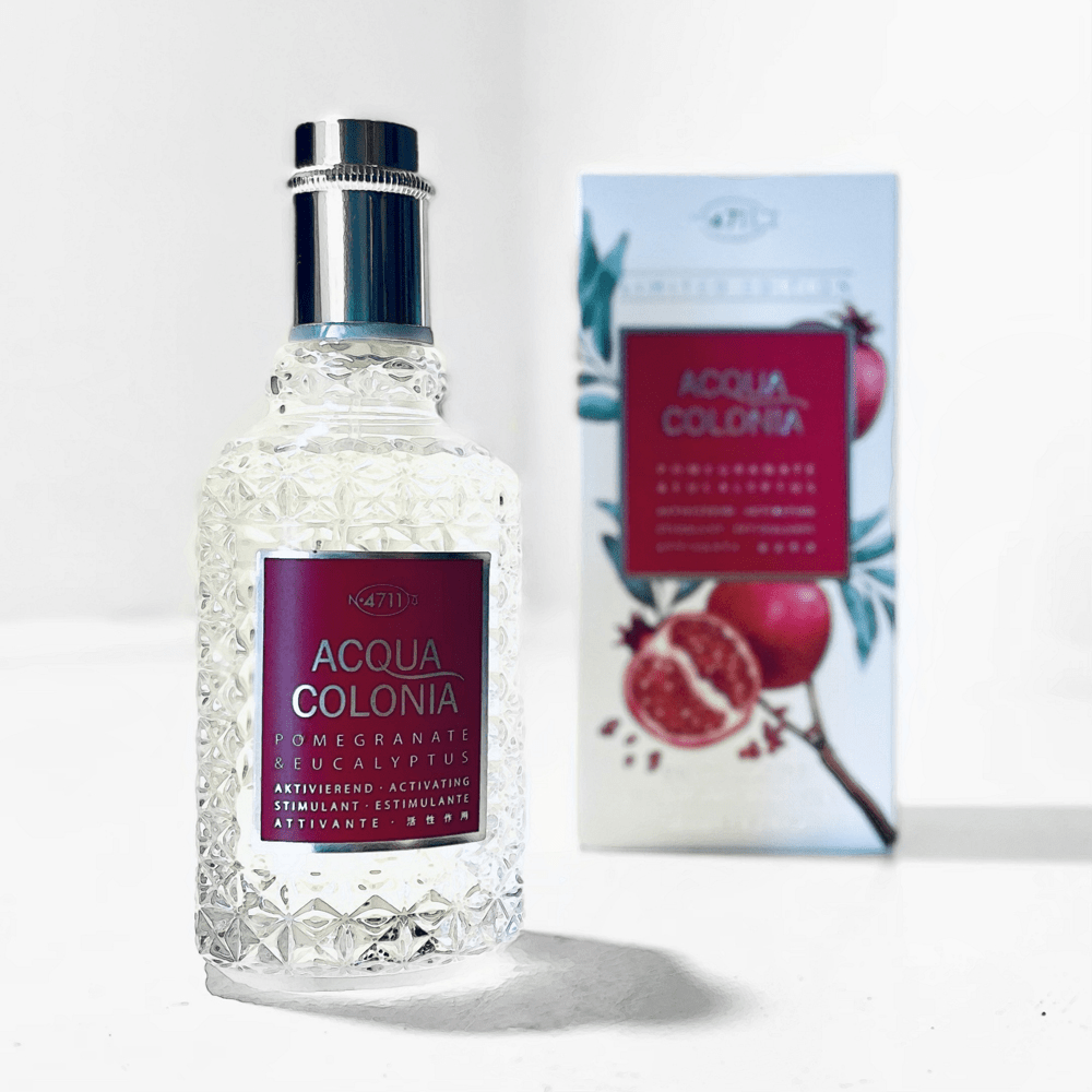 4711 cut glass flask with silver cap and red and gold label, and box with pomegranate vine.