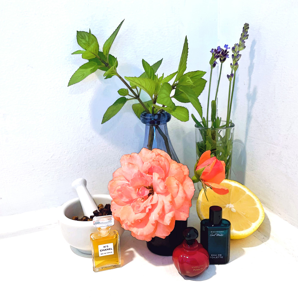 Fresh spearmint, lavender and roses, cloves in a mortar and pestle, half a lemon, and mini bottles of Hypnotic Poison, Chanel No. 5, and Cool Water.
