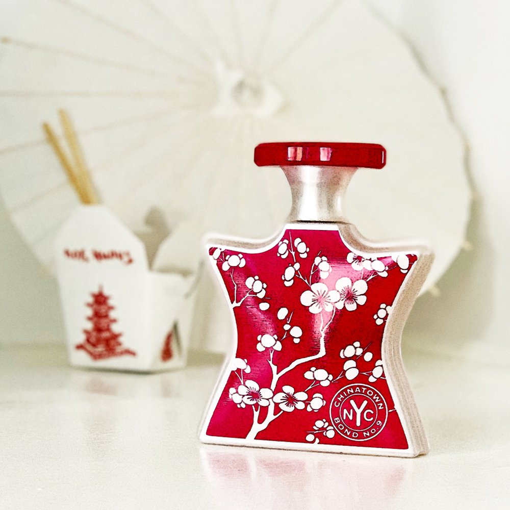 Bond No. 9 sample sprays and bottle shaped cut out tester with red cherry blossom design, and a fortune cookie. [The best way to make a friend is to be one.]