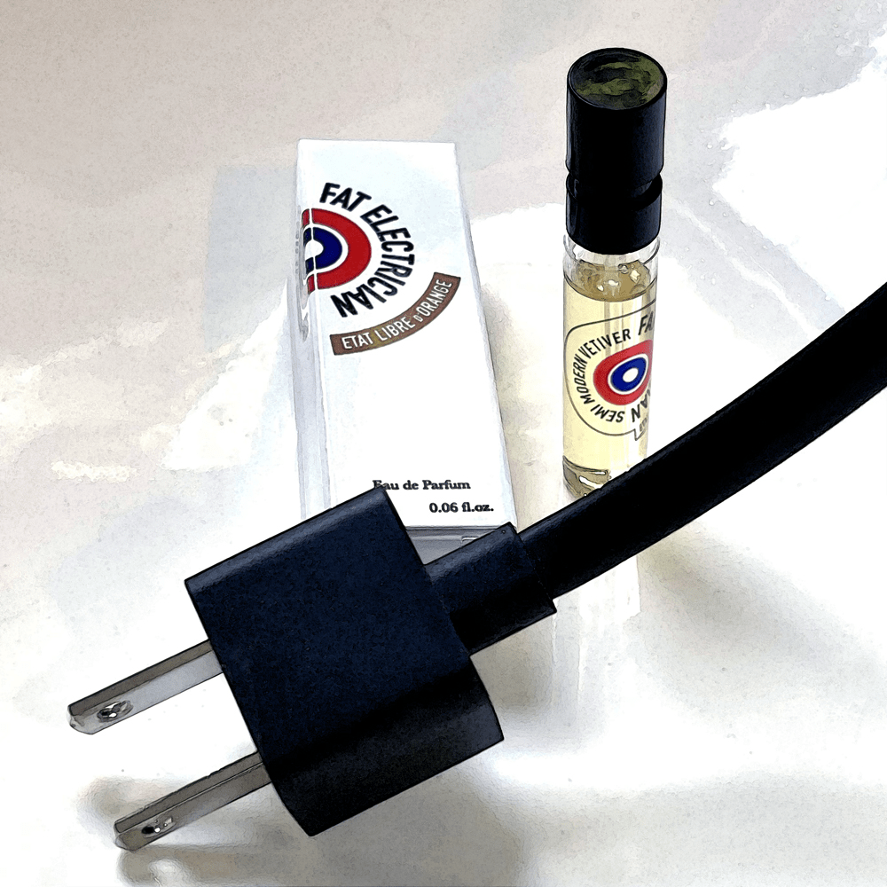 Etat Libre d’Orange sample spray and box, and a power supply plug.