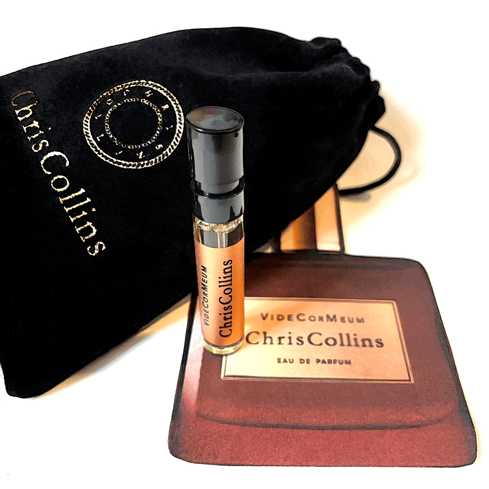 Red bottle paper cutout tester, black velvet bag and sample spray–all with luxe copper accents.