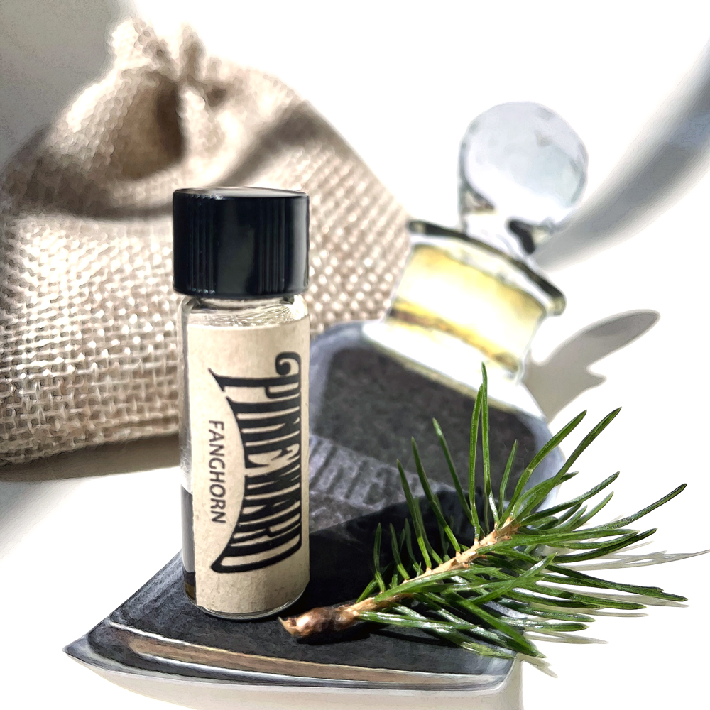 Pineward sample vial and paper test cutout of Fanghorn bottle, burlap pouch and a taxus tip with green needles.