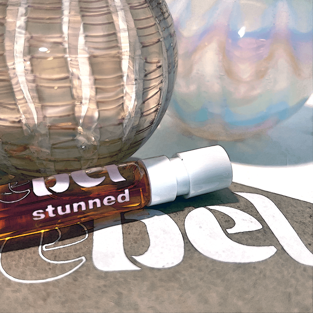 Rainbow blown glass, and Bel Rebel sample spray and envelope.