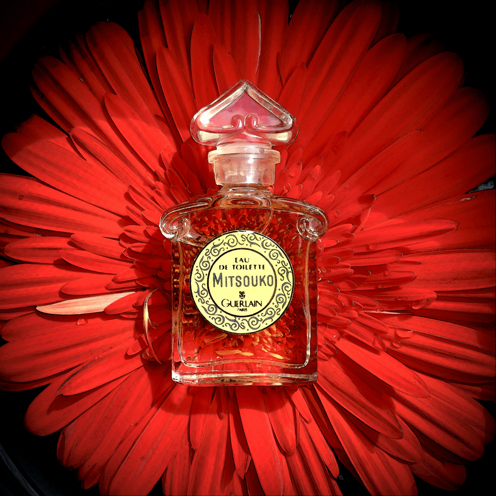 Mini scrolled bottle of Mitsouko Eau de Toilette at the center of a crimson firework Gerbera daisy.