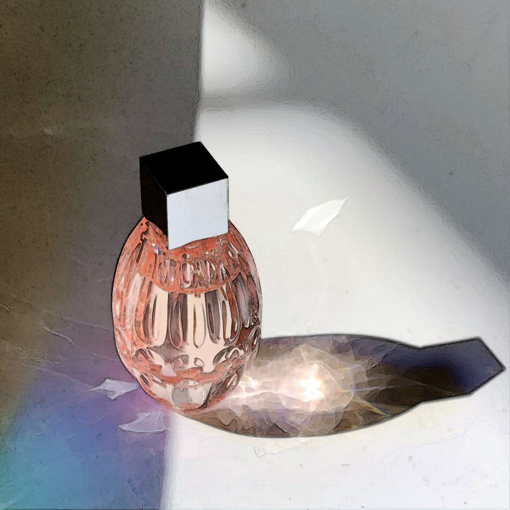 Ballet pink cut glass Jimmy Choo mini bottle in prism light, casting sunburst shadows.