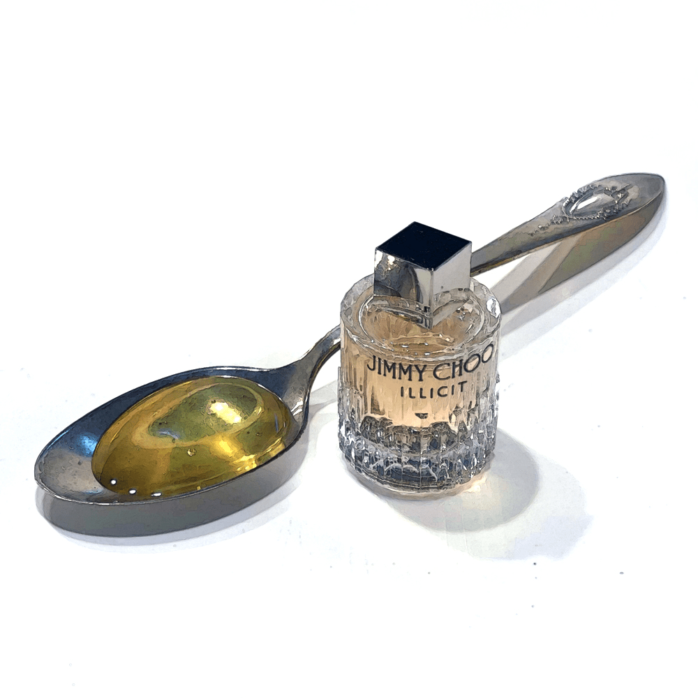 Mini cut crystal bottle with pale ecru eau, and a silver teaspoon of golden honey.