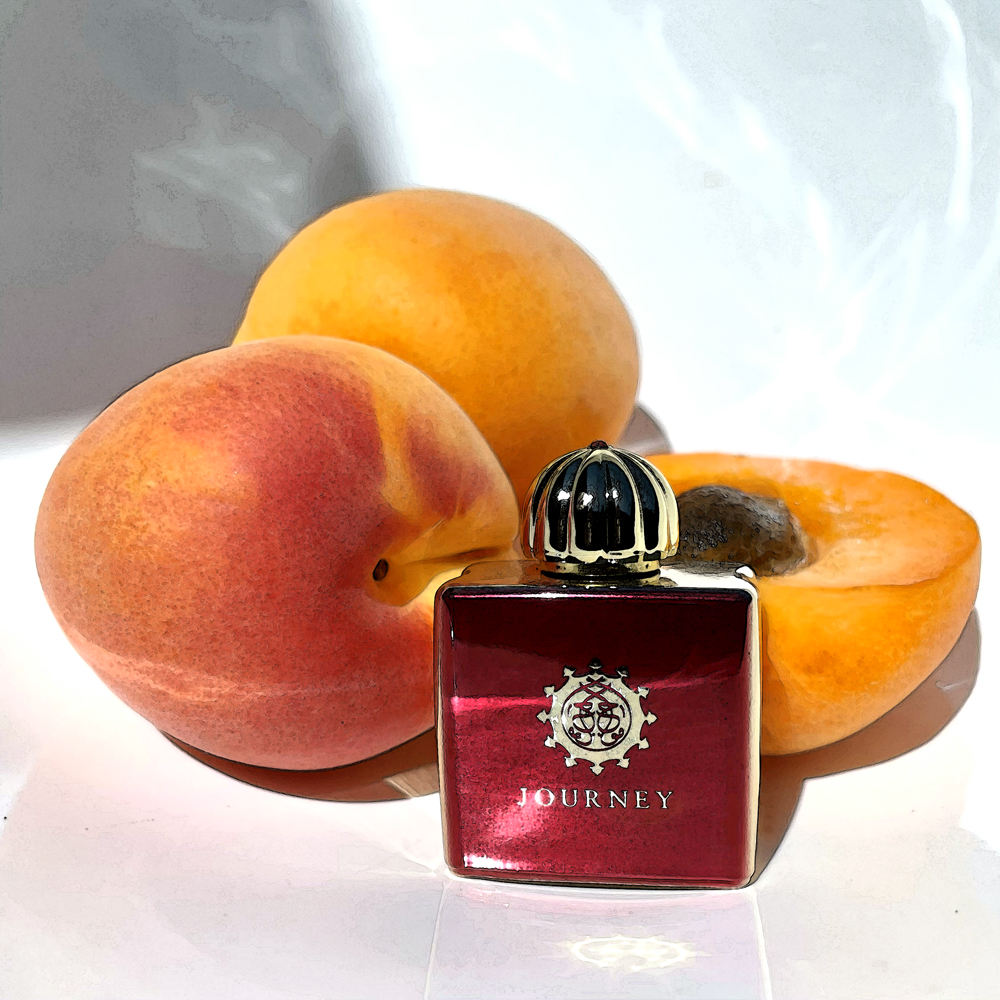 Red faced gold Amouage mini bottle with domed cap, and apricots.