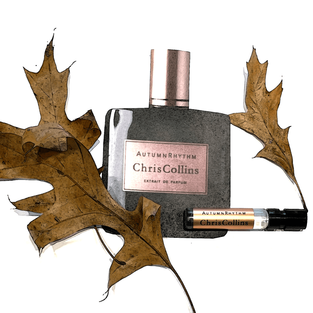 Paper test cutout of Chris Collins black and copper bottle, sample spray and fallen leaves.