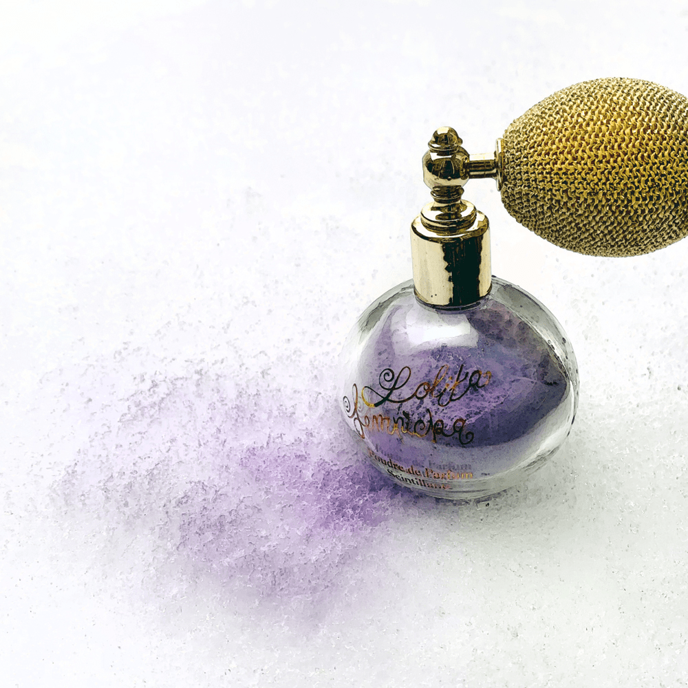 Lolita Lempicka powder atomizer globe in a snowbank with lavender spritzed snow.
