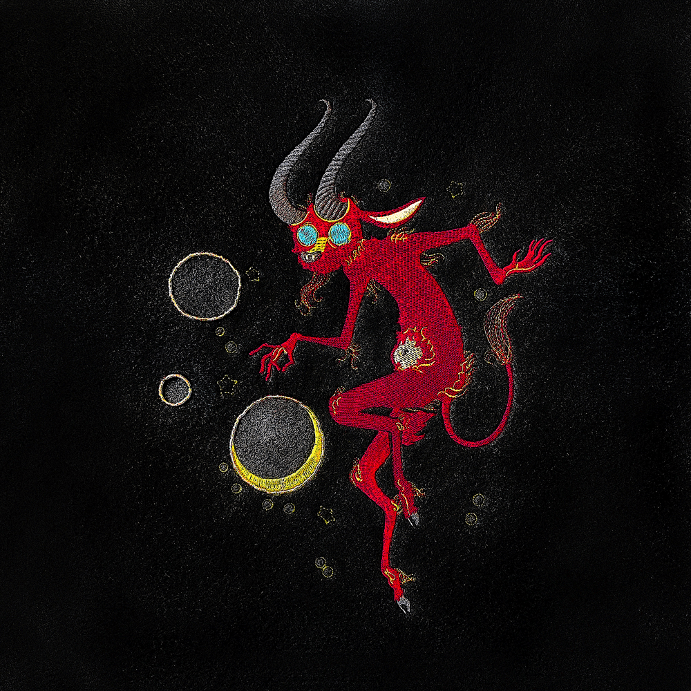 An embroidered Slavic demon popping a beaded soap bubble.