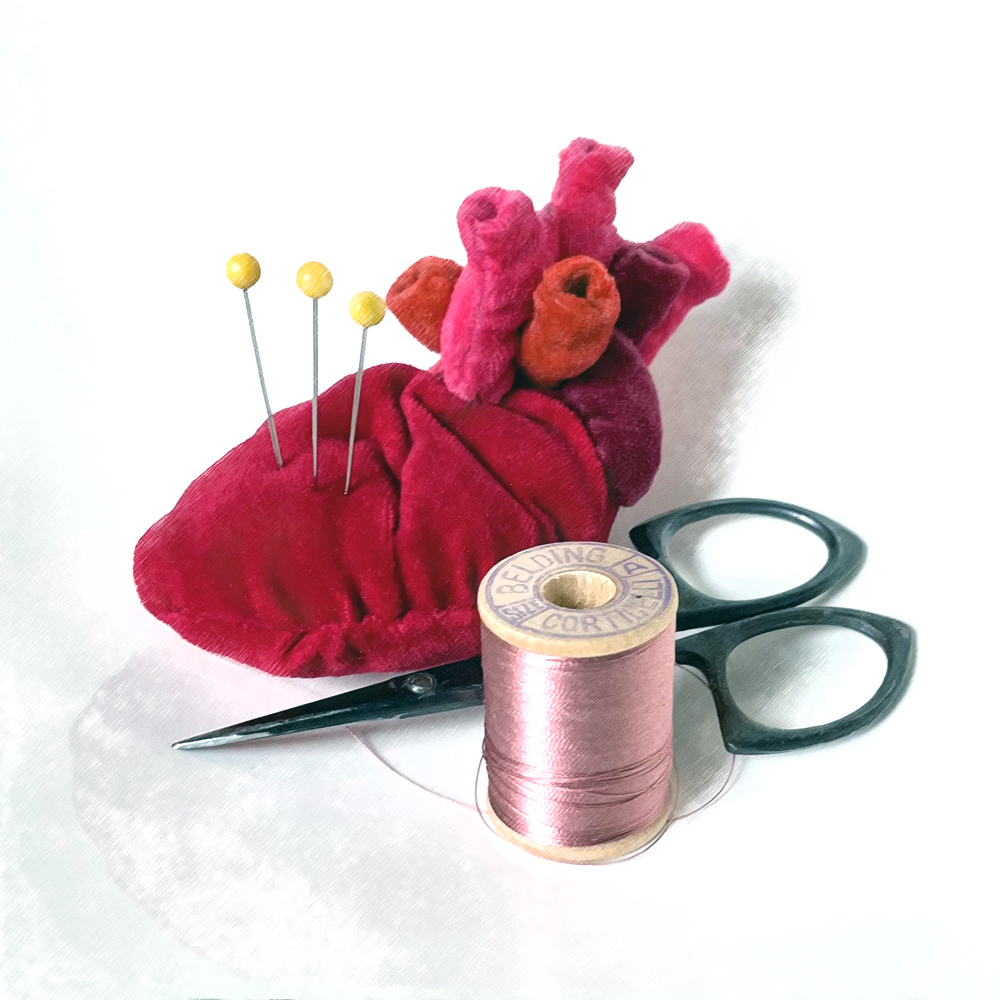 I take him home. He takes my clothes, and the rest of me, in the most sinful ways. I darn his coattails while nude, needle flicking stitches under his hot gaze. He’s hypnotized by the flashing silver as the parzenica patterns close the ripped hide with chain-stitched hearts. When I prick my skin, he sucks my fingertip, and other places too.