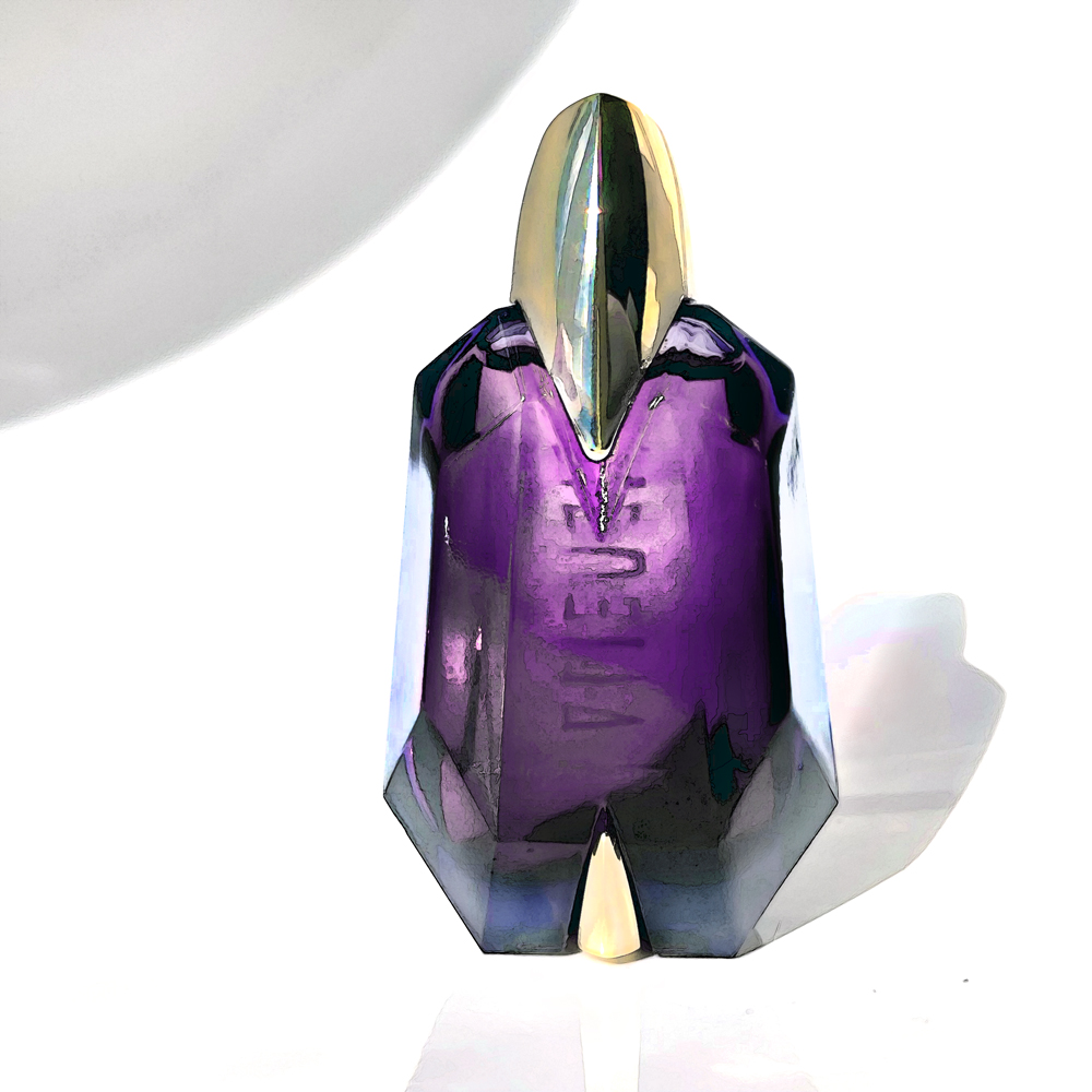 Mini bottle with lines mimicking the iconic sixties extraterrestrial in a high collar cape, showing off Thierry Mugler’s design aesthetic of bold complementary colors–a bright purple glass with gold accents.