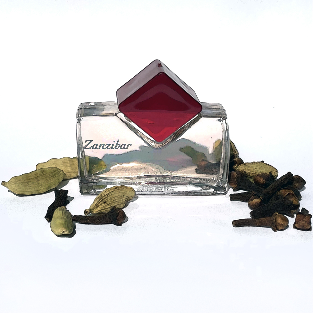 Clear rectangular bottle with offset red square cap, and cardamom pods and cloves.