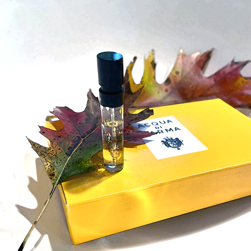 Yellow Acqua di Parma discovery set box, with black capped sample spray, and turning oak leaves.